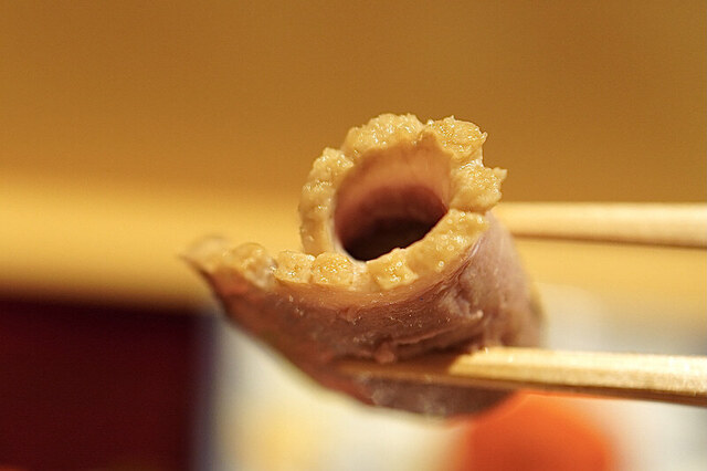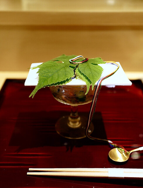 フォアグラが入った最中や梶の葉を取った時に姿を見せるキラキラした魚介類。