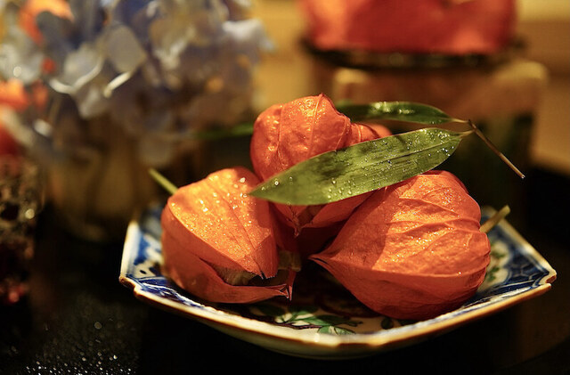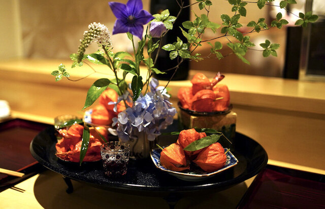 例えば、八寸はまずその大きさにびっくりする。お盆を演出した鬼灯を使ったものだったが、