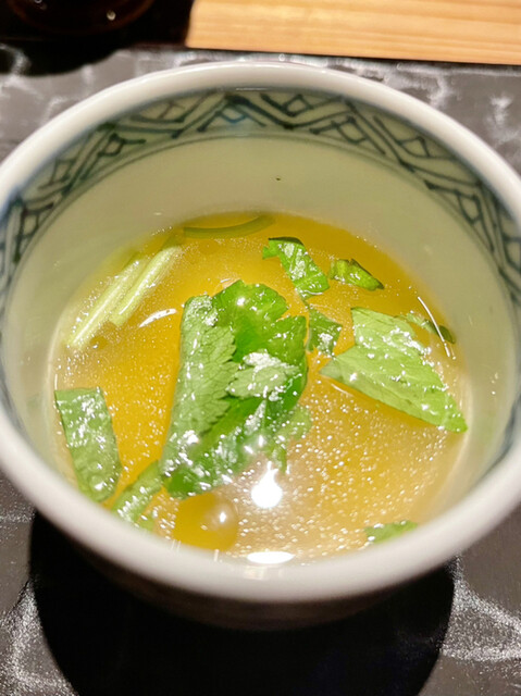 最初は胸肉の揚げ出しと金時草のお吸い物 これは口が優しくなる味です アイドリングにぴったりですね
