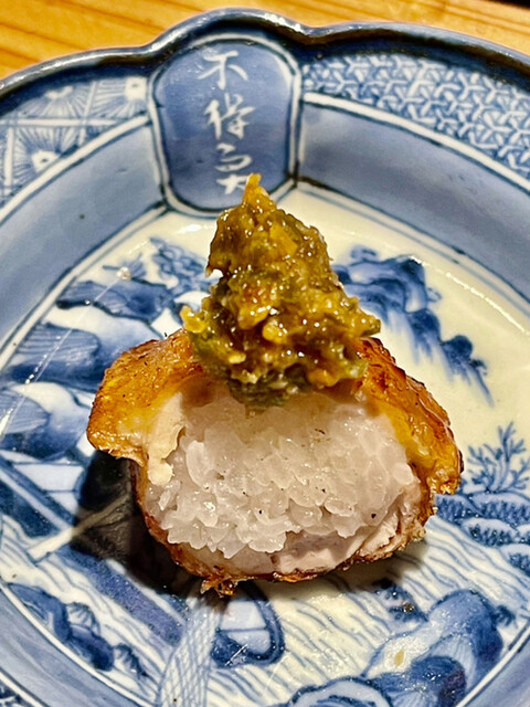 お通し代わりの椀物は黄金軍鶏のムネ肉揚げ出しに蕗の薹が浮かんでいるのかと思ったら蕾菜だそうです。