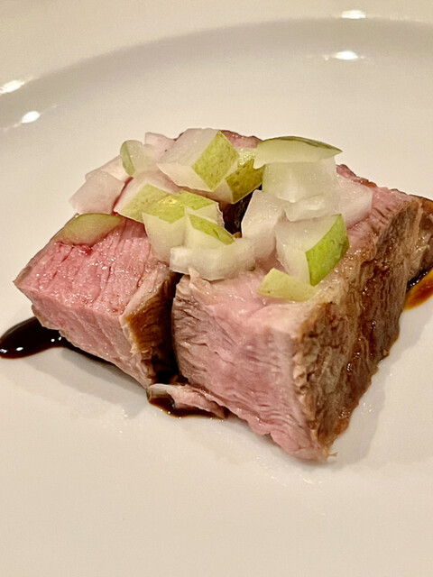 全くサシの入っていない赤身の秋田錦牛が表面だけ火入れして、甘味と酸味のバランス絶妙なロビオラチーズのソースを纏って登場。
