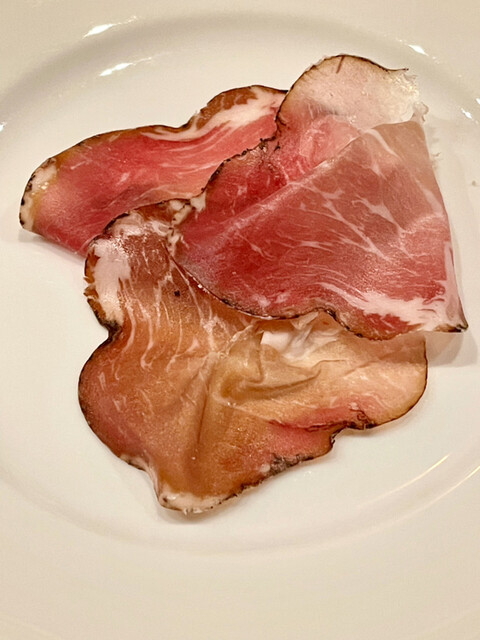 牛肉(主に赤身)を塩漬けにした生ハムがブレザオラですが、鴨でもしっとり出来上がるんですね。