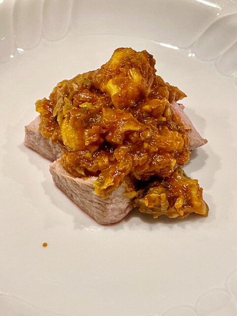 雌の桜豚をじっくりローストして賽の目くらいに切り、何と少量の海鼠が和えてあってさらにパイナップルが加えてありました。