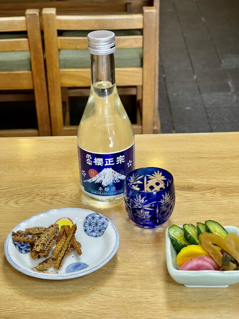 こちらのお新香は予め醤油がかかっており、まあそれはそれで良いのですが、塩分が気になるお年頃の私としては少量ずつ口に運んで酒のアテにします。