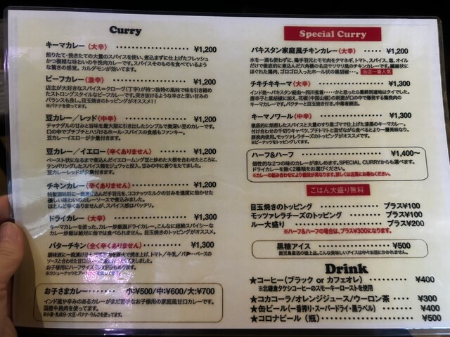 美味しそうなメニューは大辛が多いため、中辛のチキンカレーと大辛のドライカレーを注文。テイクアウトはルーのみも可能です。