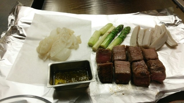 アスパラやレンコンもこだわりが感じられます。だってうまいもん!ステーキには塩やしょうゆ味のソースやバーニャカウダまでついてた!