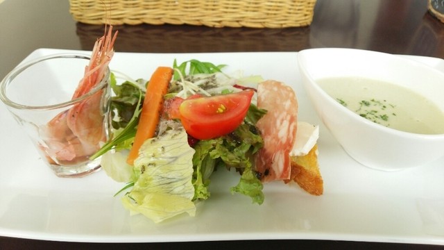最初の前菜についてるスープはじゃがいもと春菊のスープでした。