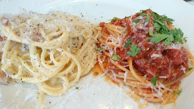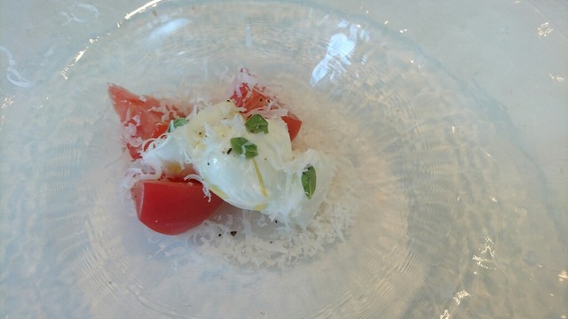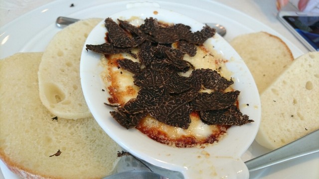 前菜のトマトが甘くて美味しいのを皮切りに、一味違うカマンベール、トリュフ、それに食べたことない美味さのベーコンや燻製ハムがパスタにゴロゴロ。