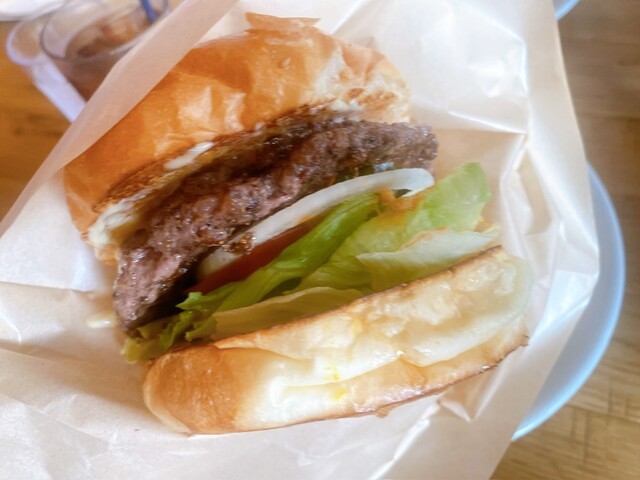 たっぷりのチーズに二枚のパティ、トマト、レタス、タマネギの入ったバーガー。大きさはやや小ぶりかなと感じましたが、味はとっても美味しい✨ポテトは皮付きと細切りの2種類から選べます。