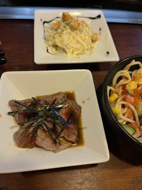 今回は選べるちょこっと3品、牛たたきと牛たたきユッケ風、スモークチーズを頂きました。あとは餃子と鶏ハラミナンコツのちょっと辛いエスニック風のとたこぶつに塩バター焼きそばとミックスお好み焼きを頂きました。