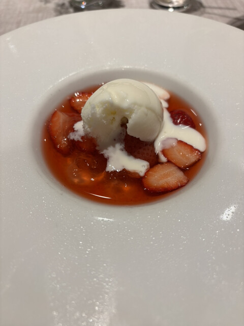 デザートは、生のいちごとコンポートを合わせてバニラアイスにヨーグルトをかけていただきました!