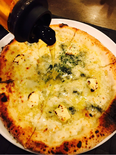 MIYAは、はちみつをかけて食べるフォルマッジオに!焼きたてのピザ最高ぅ❤️チーズが濃厚で、はちみつをかけて食べると最高のマリアージュ!で感激❤️