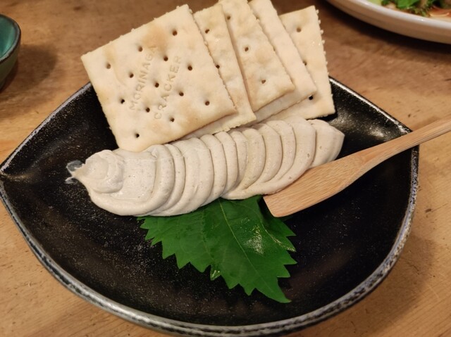 会議後の会食で既に食事していたため、日本酒 0.7合を2杯、アテに「かにみそクリームチーズ」を注文。日本酒はいいものを揃えています。当日はメニューに9銘柄、そのうち3銘柄はひやおろしでした。キレのある辛口よりも甘みや旨味を感じる日本酒が好みの私は、「作 恵乃智 純米吟醸」660円、「南部美人 純米吟醸」638円を注文。何も言わなくても和らぎ水が提供されます。