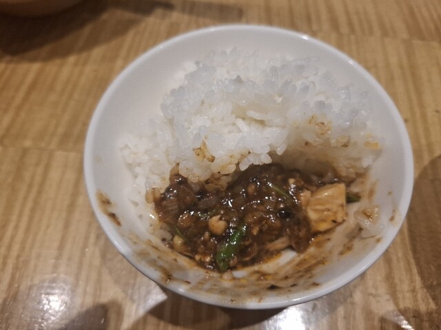 陳麻婆豆腐をご飯にのせた様子、その3です。