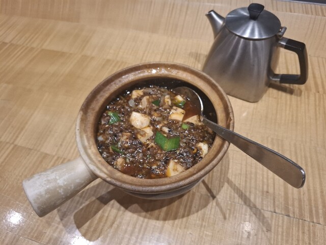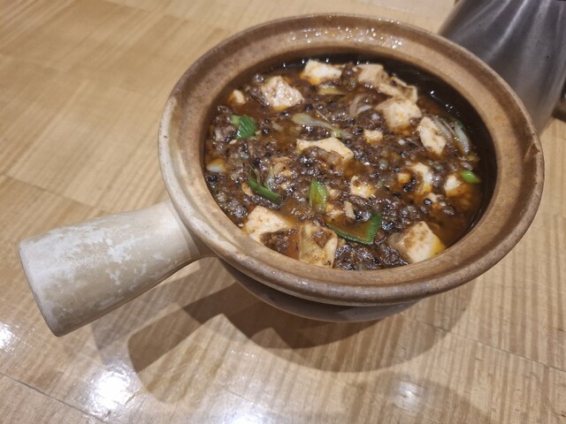 四川飯店伝統の麻婆豆腐です。土鍋に入れられています。