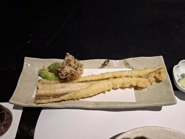 長崎県産の穴子の一本揚げの拡大写真です。茸、しし唐が添えてあります。