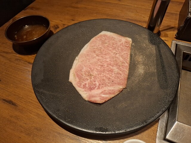 網の鉄板で焼いてもらった後、おろしポン酢に浸けてサンチュの上にのせ、サムジャンもつけた北海道産の大判サーロインです。