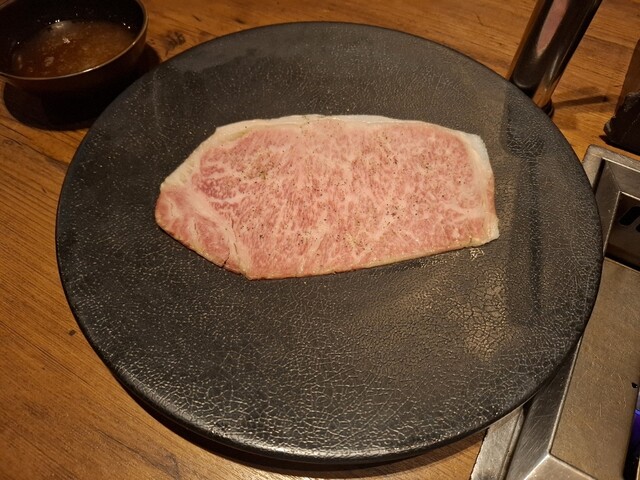 ちなみに焼肉は、まず最初に大判サーロインから焼いてもらってその後厚切りサーロインを焼いてもらうことにした。濃厚コラーゲンのコムタンスープとうしごろサラダを満喫し終わると、私のテーブルには鹿児島県産の大判サーロインならびにポン酢が運ばれてきたのである。今回、焼肉の調理を担当したのも女性スタッフではあったが、前回とは違った人が担当となった。その女性スタッフは、網の鉄板の上に牛脂を塗った後大判サーロインを焼いてそれをハサミで半分に切り、ポン酢の中に入れたのであるがその後私は牛脂もポン酢の中に入れたのである。