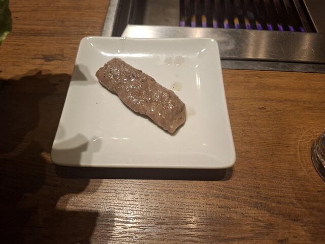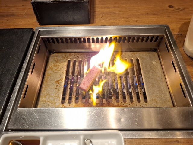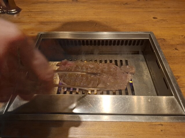 塩ダレのトモサンカクとリブ芯のいずれか残り1枚を、網の鉄板の上で焼く様子のその1です。