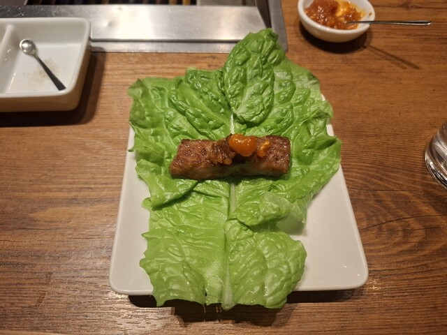 網の鉄板で焼いてもらった後、おろしポン酢に浸けてサンチュの上にのせ、サムジャンもつけた北海道産の大判サーロインと牛脂です。