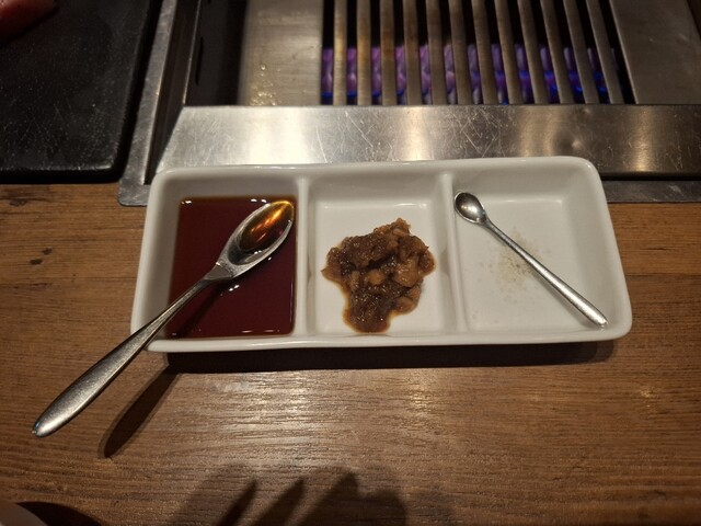 厚切りサーロインに浸ける薫製醤油、おろしポン酢、塩です。
