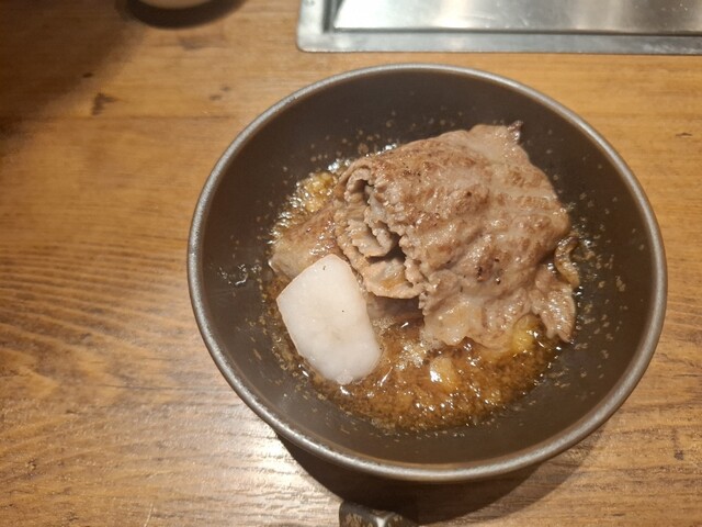 焼いた鹿児島県産の大判サーロインを、おろしポン酢に浸けた様子です。