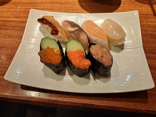 ほたて、大トロサーモン、穴子、金華さばの握り寿司と塩辛、明太子、いくらの軍艦巻きです。