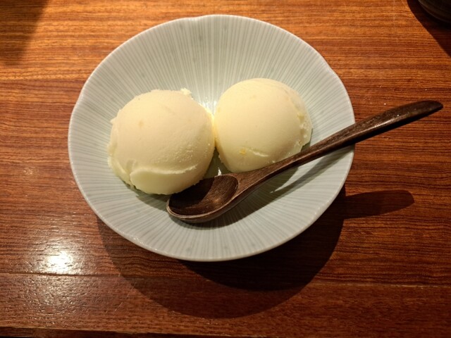 一方軍艦巻きでは、塩辛軍艦がとても印象に残った。何故かと言うと、烏賊の塩辛の濃厚な旨味と周りの海苔、酢飯が一心同体となって極上の旨味を引き出していたからである。最後の食後のデザートはゆずシャーベットをいただいたのであるが、こちらもさっぱりとした口あたりだった。