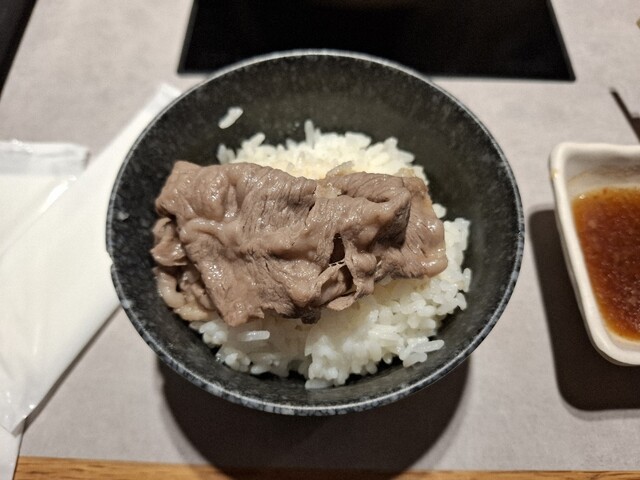 豆乳スープでしゃぶしゃぶした、埼玉県産の霜降り黒毛和牛サーロインをポン酢に浸け、雑穀米の上にのせた様子です。