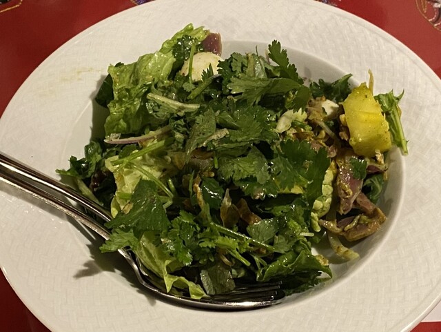 たっぷりのパクチーと砂肝にうずらのたまご。いちごなどのフルーツはなし。価格高騰のためかと思うが、一皿の中での味のバリエーションが減ってやや寂しい