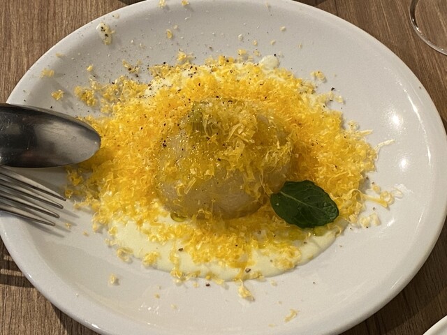 モルタデッラの特徴的な香りと塩味、かぼちゃの甘味、ブッラータのもちっとした食感とミルクっぽい爽やかな風味のチーズ、それに上に振られた香辛料をまとめて口に入れると非常に美味。