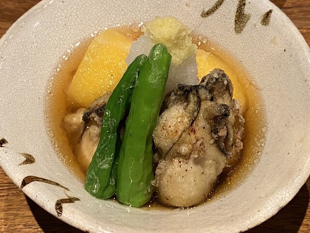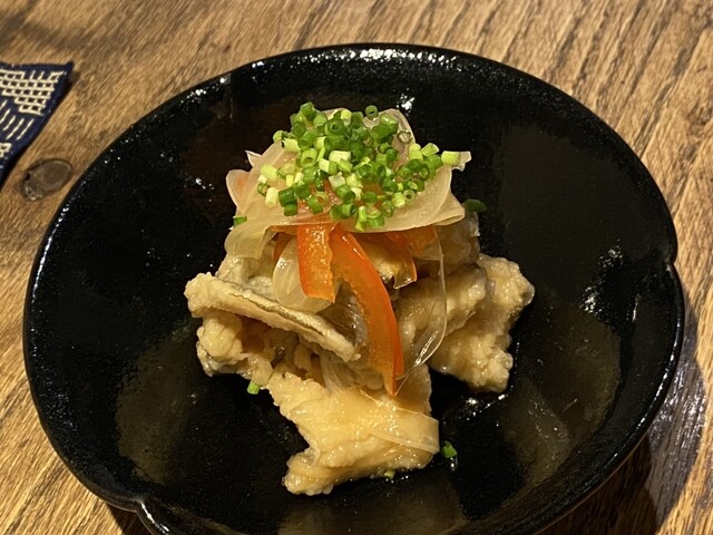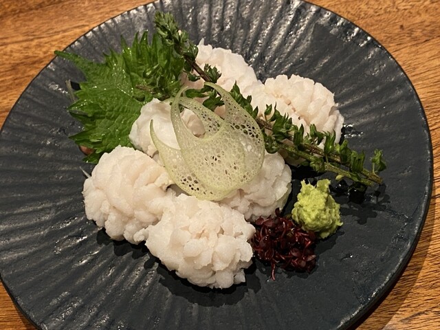 お通しの花わさびは甘酸っぱい出汁に花わさびの辛味もあり非常に美味。単品メニューにもあり、おかわりしようかと思った。