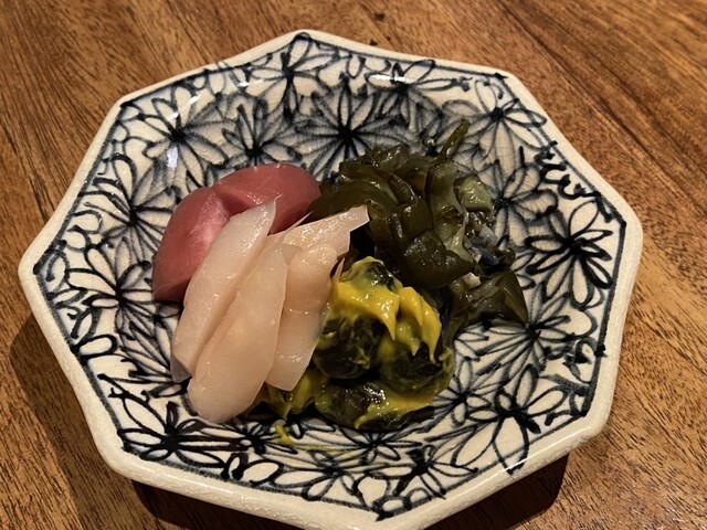 ・お漬物の盛り合わせは四種類で、どれも美味なんだけど、特に小茄子の辛子漬けが甘辛くてとても美味しい。お店の方曰く、これは秋田のもので東北地方でよく見られるお漬物なのだとか