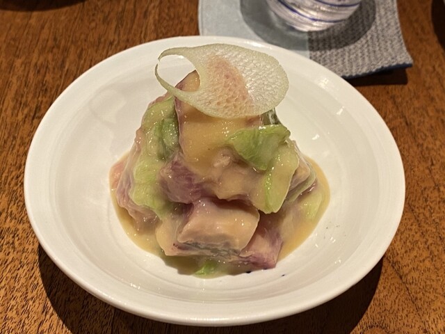 お通しがまぐろと菜花のぬたで、非常に美味。スターターで酸味のあるものは食欲を増すのにすごく良いかも。