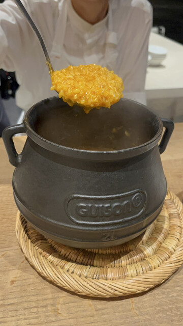 渡り蟹のビスクのリゾット。ギューッとうま味が凝縮されています。