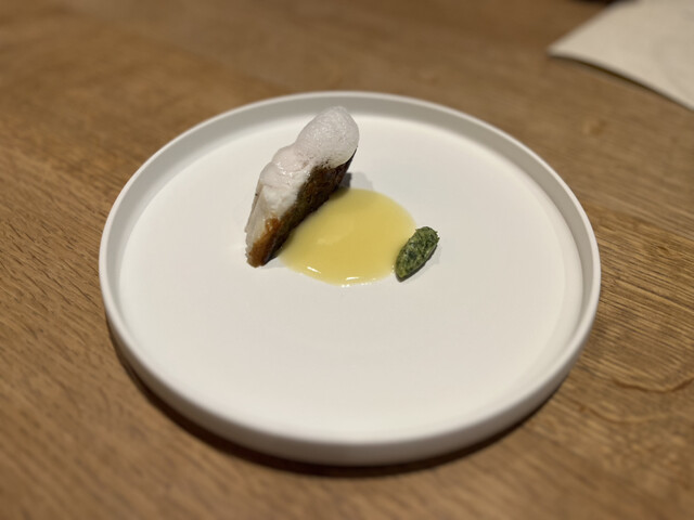 また、抜群の火の通りのアイナメに合わせた山椒の白い泡、そして山椒の木の芽がピルピルというソースにアクセントを加えていました。