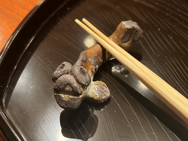 席に座り、まず奥に鎮座する見たことがないくらい、太く大きい松茸に圧倒されます。目の前に持ってきて見せてくれましたが、それだけで周りは松茸の香りに包まれます。