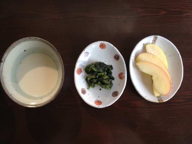 こたつに入ってお茶でなごんでいると、手作り豆腐、りんごのマリネ、大根葉のつけものが。