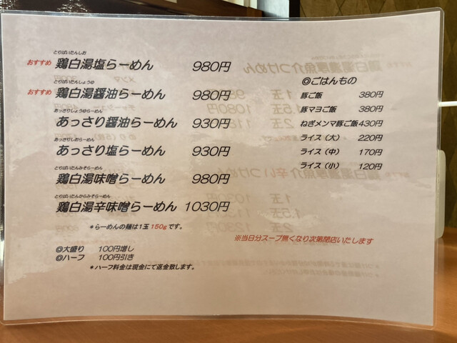 メニューは鶏白湯(塩、醤油)の他にあっさり系の鶏清油(塩、醤油、味噌、辛味噌)や鶏白湯のつけ麺など