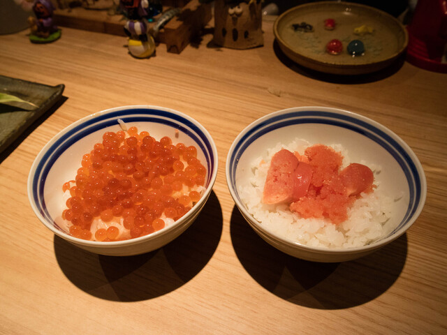 吞兵衛かつ大食いの私の食べっぷりを見て、ご主人が最後に生たらこといくらの醤油漬けを乗せたご飯を出してくれました。