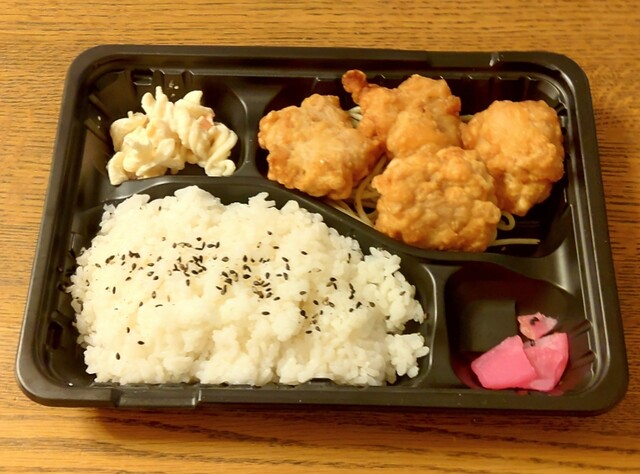 唐揚げはそこまで大きくないものの、4個入っています。この唐揚げが冷えてても結構旨い。