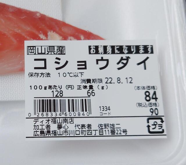 黒鯛(チヌ)刺身用 132g (税抜)195円 商品ラベル(2022.10.06)