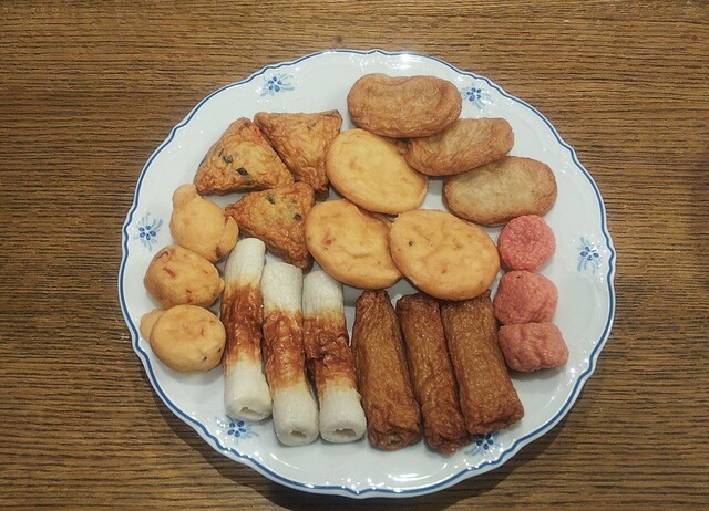 生ちくわ、ごぼう巻き、さつま揚げ、がんもボール、がんも、赤ボール、お魚豆腐揚げが