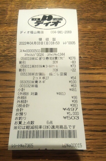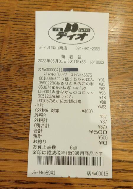 計6点買って、ちょうどワンコイン(計500円)の支払いでした。
