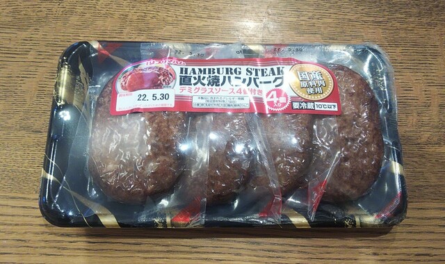 直火焼きハンバーグ4枚入り (税抜)221円 (2022.06.06)