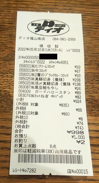 計12点買って、計1,998円の支払いでした。※レジ袋代5円含む。
