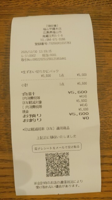 最終日なので、販売商品は少なくなってましたが、そんな中「生ズワイ蟹 (税込)5,600円」を購入。