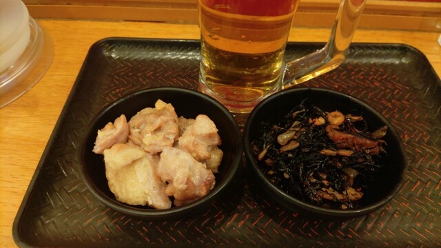 生ビール (税込)390円 / 味付け鶏肉 (税込)50円 / ひじき (税込)50円 ※正面から (2025.04.05)