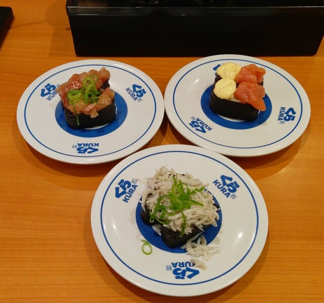しらす軍艦 (税込)115円 / 旨だれまぐろ軍艦 (税込)115円 / たらマヨ (税込)115円 ※正面より (2025.03.18)