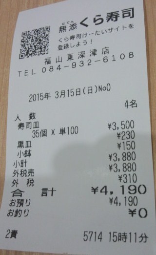 今回はお寿司×35皿食べて、これにシャリコーラ一杯飲んで、食べて計3,974円でした。